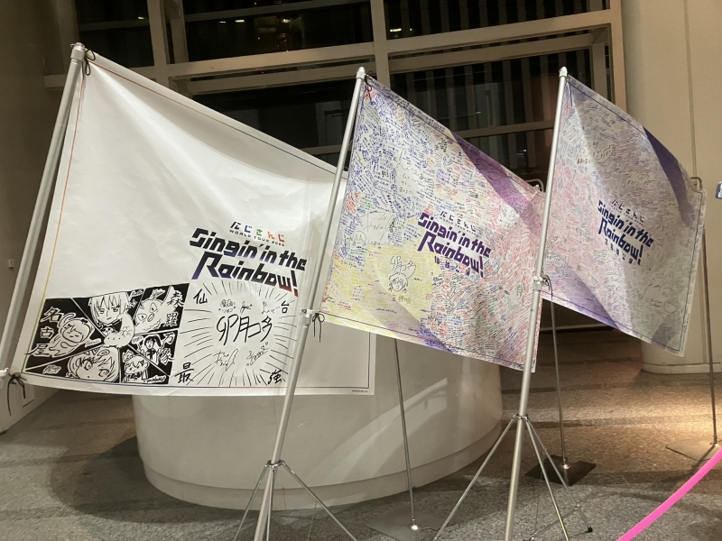 続いては、先斗さんと同じく音楽ライブ初出演ながら、すでに堂々としたパフォーマンスを見せている小清水さんのソロ。二人がけのベンチにちょこんと座って、マルシィのラブバラード「未来図」をしっとりと歌い上げた。基本、夜遅い時間にパソコン前で働いている筆者にとって、深夜長時間配信で小清水さんの声を聴くことはほぼ日課に近いのだが、小清水さんの歌声の魅力には、この名古屋公演で改めて気づかされた。柔らかく伸びやかな歌声は、アコースティックギターの音色との相性抜群。いつか、生ギターとの共演も聴きたいほどだ。
