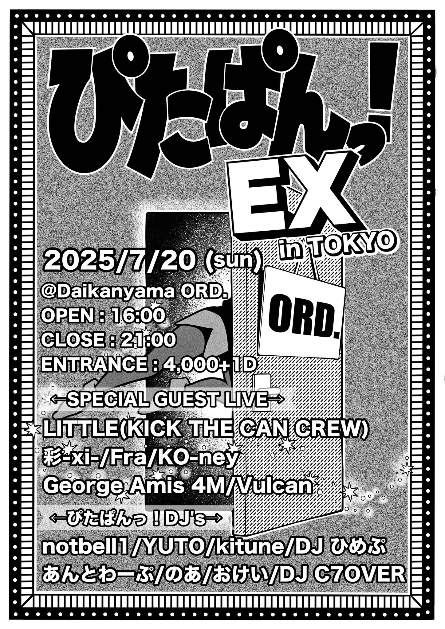 元BOOGEY VOXXのFraが、2025年7月20日に代官山ORD.で開催予定となっている『ぴたぱんっ!EX in TOKYO』に出演することが発表された。KICK THE CAN CREWのメンバーであるLITTLEを筆頭に、ビートメイカーとして活躍するKO-ney、彩-xi-らラッパーらが出演する。