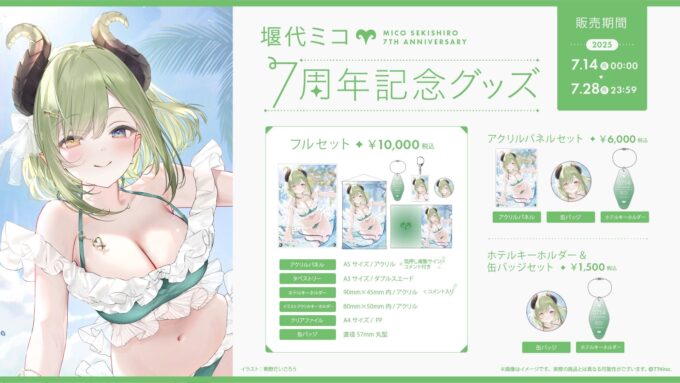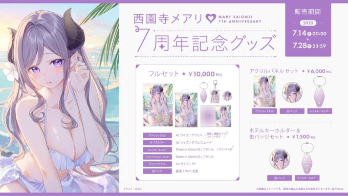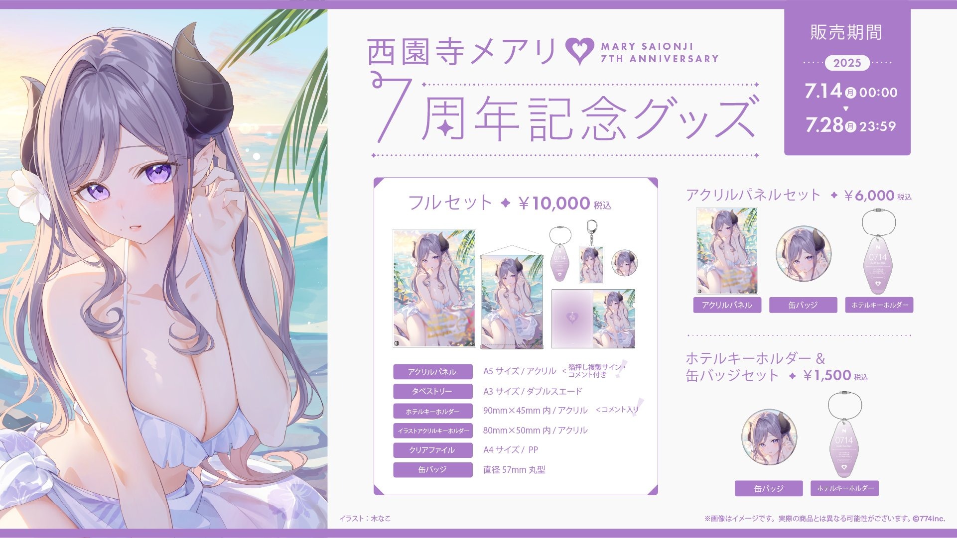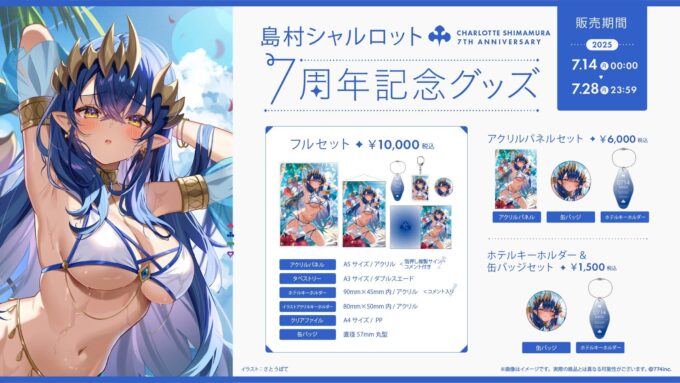 ななしいんくに所属している島村シャルロット、堰代ミコ、西園寺メアリの3人が活動7周年を迎えたのに合わせ、ななしいんく公式ショップにて活動7周年記念グッズの発売がスタートした。
