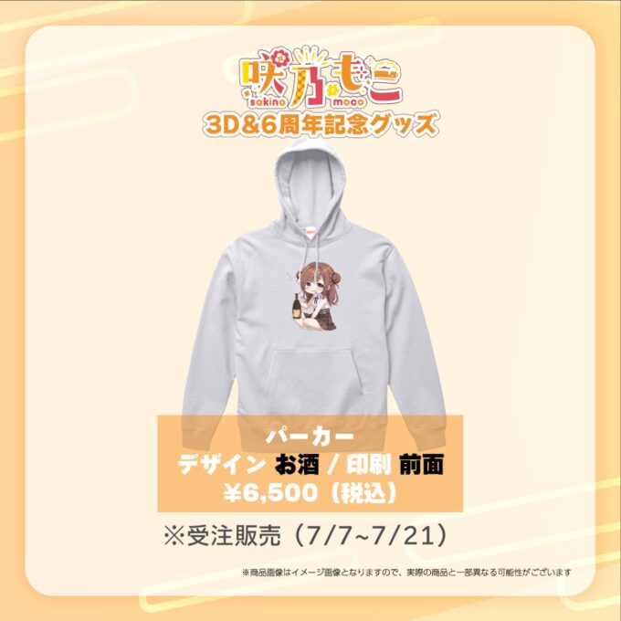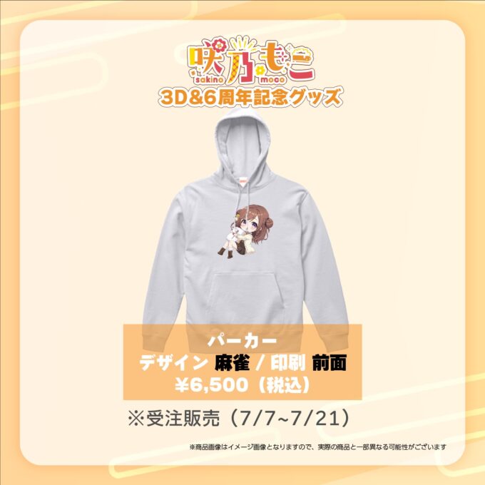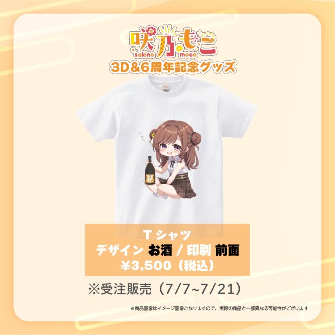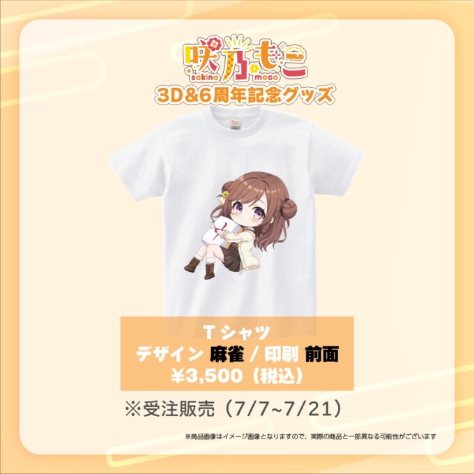 咲乃もこが7月7日にデビュー6周年を迎え、翌8日には自身の3Dビジュアルを初お披露目したことをうけ、3D&6周年記念グッズが発売開始となっている。受注盤賠償品となっており、7月21日23時59分までうけつけている。