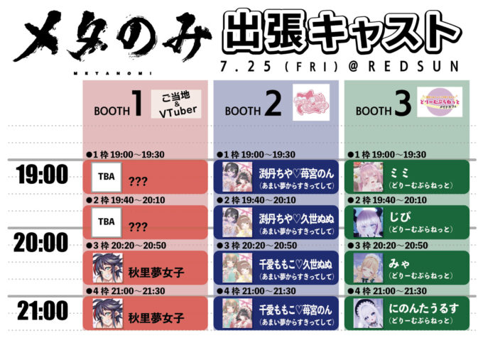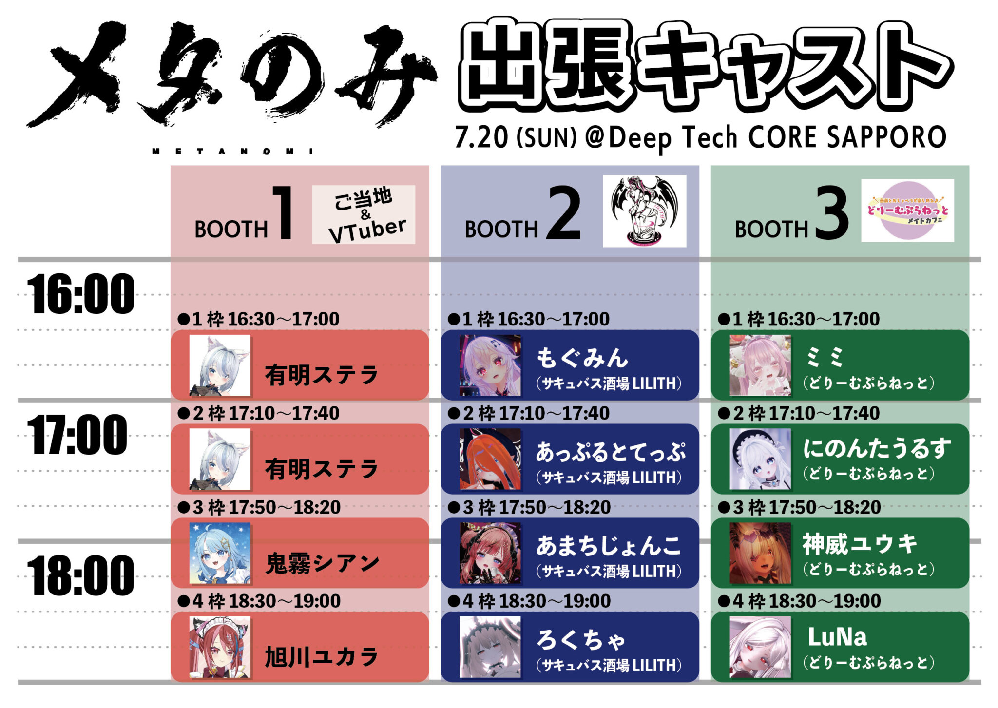 札幌のメタのみは大きく分けて、VRChatをはじめとするメタバースを盛り上げてる企業ブースと、人気キャストやVTuberさんと1対2でお話しできる「出張キャスト」の企画をご用意。メインスポンサーとして、札幌に本社があるインフィニットループさんにご支援いただいております。