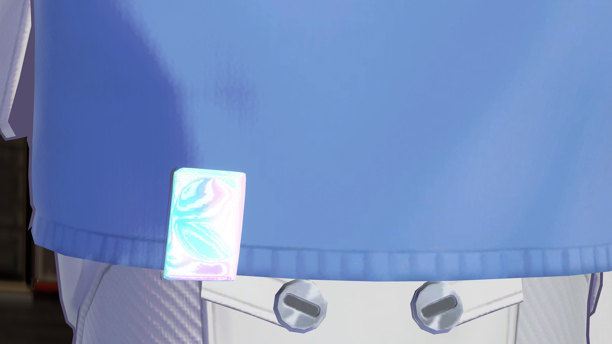 個人的な感激ポイントは、タグや靴底のオーロラに光るマテリアル。モデリング担当のせうによると、ホログラムのように、見る角度によって少しずつ風合いが変化するテクスチャー感を表現するため、ノーマルマップとマットキャップを組み合わせたという。細部まで美しい衣装だと思った。