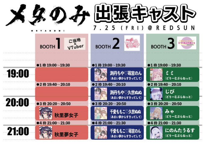 メタバースの文化といえば、もちろん写真だけじゃありません! 今回、メタのみ初のライブハウス開催ということで、VRChatで活躍する4組のアーティストたちのステージをお届けします。また、「出張キャスト」は、VRChat上でイベントに出演する人気キャストや、ご当地のVTuberさんを現実空間にお招きして、一緒にお話ししながら飲めるブースとなっております。