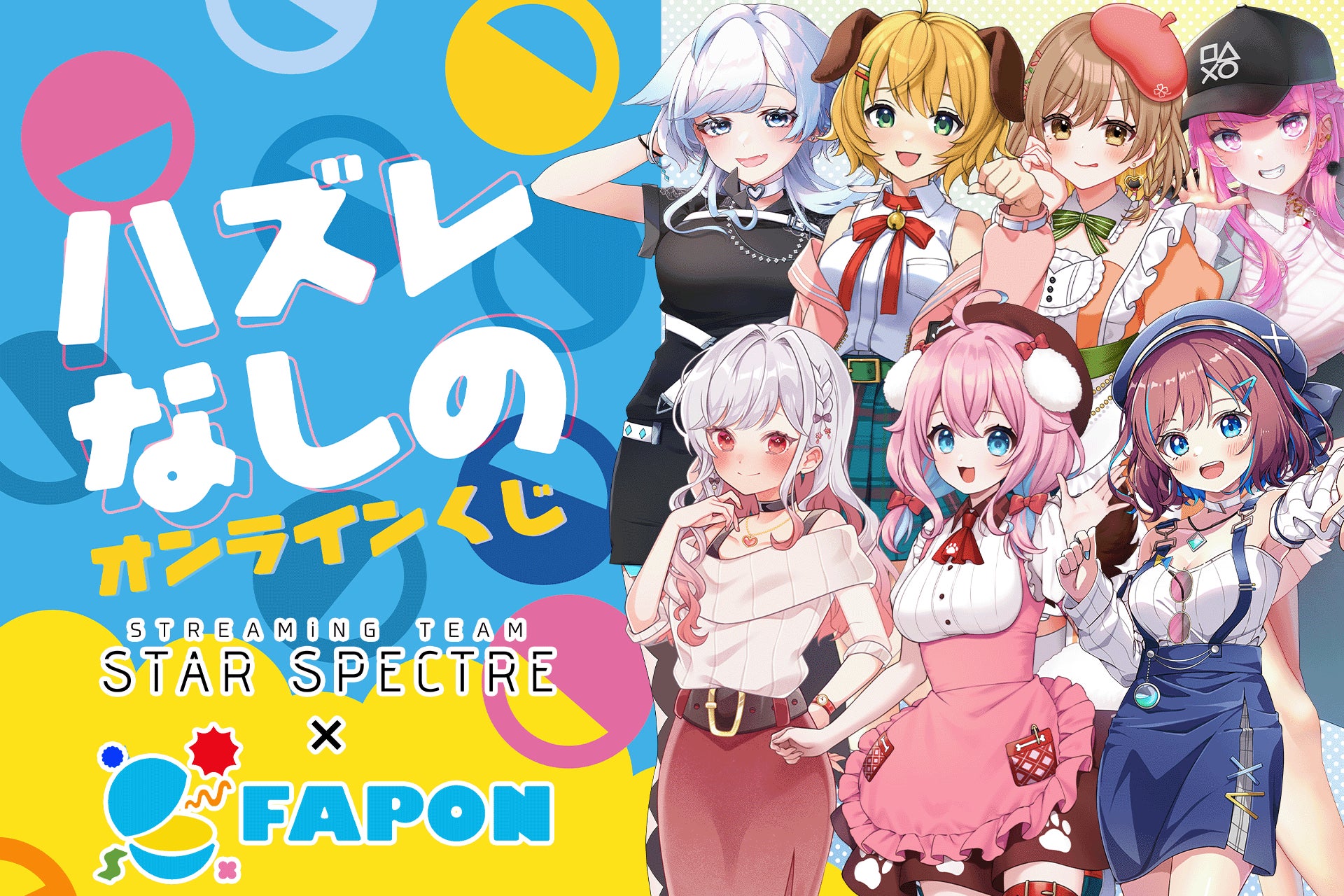 VTuber事務所として2018年創業・累計フォロワー数200万人・視聴回6,000万回などの実績を持ち、TikTok LIVEと一次代理店契約を交わしている株式会社WACTOR(代表取締役:大石昂)は、VTuber事務所としては初となる、自社「オンラインくじ”FAPON”」サービスにてVTuber事務所”すたすぺ STAR SPECTRE”全VTuberと描き下ろしイラストによるタイアップが決定したことをお知らせいたします。