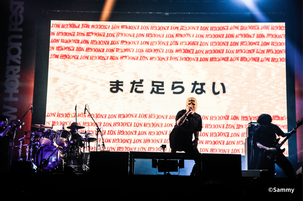 未だ正体が明かされてないVocalのMAQUMAはフルフェイスのオリジナルマスクを被った姿でステージに立ち、観客からはどよめきの声があがった。