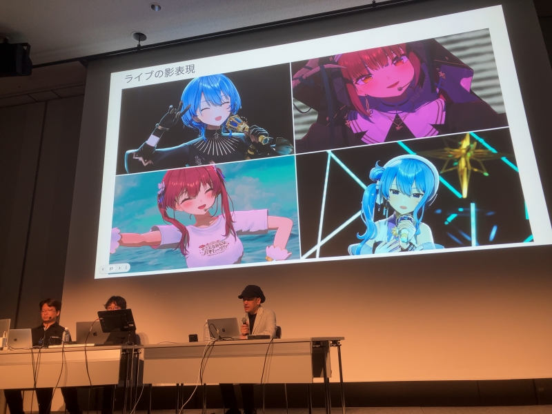 同じく24日(木)の夕方に行われた「今そこにいる!ホロライブのリアル会場ライブやARライブの実在性を高める照明演出」の講演者は、ホロライブのバーチャルライブを手掛ける3人のスタッフ。2022年にカバー株式会社に入社し、ライブシステムのリードエンジニアを務め、(ゲームエンジンの)Unreal Engineによるライブの開発ディレクターも担当している平野晶麗さん。バーチャルアーティストのライブステージの設計や演出、舞台監督を担当しているよしだたかゆきさん。舞台照明家の泉次雄さん。よしださんと泉さんは、カバーの社員ではなく、様々な専門技術を持った企業・個人が参加するクリエイティブプロダクション「TxD」に所属し、活動している。