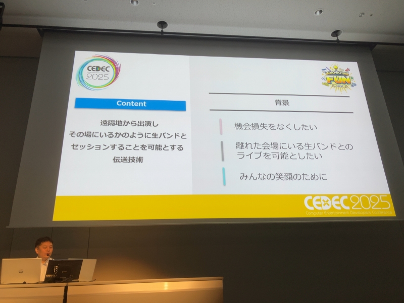 「遠隔地から出演し、その場にいるかのように生バンドとセッションすることを可能とする伝送技術」