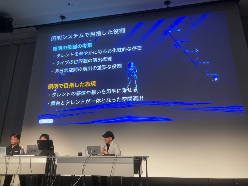 次に平野さんは、照明の役割を「タレントを華やかに彩るお化粧的な存在」「曲のテーマやライブの世界観の演出表現」「非日常空間の演出の重要な役割」とロジカルに説明。加えて、平野さんたちが照明システムで目指したこととして、「タレントの感情や想いを照明の陰影でも表現」「舞台とタレントの一体感をより高めるために、リアル会場の照明と違和感のない同期のとれた照明表現」を挙げた。そして、照明家の泉さんは、バーチャルアーティストのライブにおいて、何よりも大事にしていることとして、平野さんの言葉に同意しつつ、「今まさにそこにいる感。実在感」を挙げた。