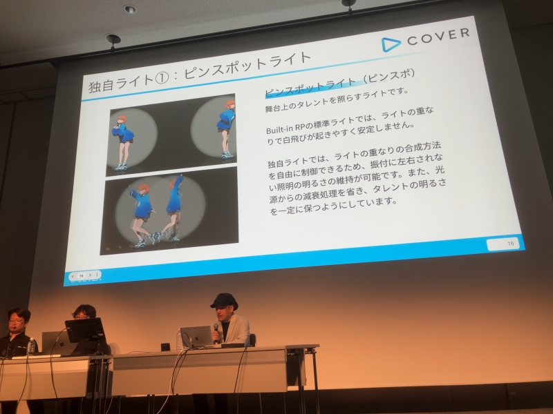 ホロライブのライブで実際に使用されているライティングシステムを平野さんが解説するパートは、かなりテクニカルな内容だったが(CEDECは本来そういうイベント)、我々が何気なく観ている光と影の表現は、様々な独自システムや工夫などで成立していることがよく分かった。スポットライトに照らされた2人のタレントがステージ上ですれ違うだけでも、Unity標準のシステムでは白飛びなどの問題が発生するそうだ。
