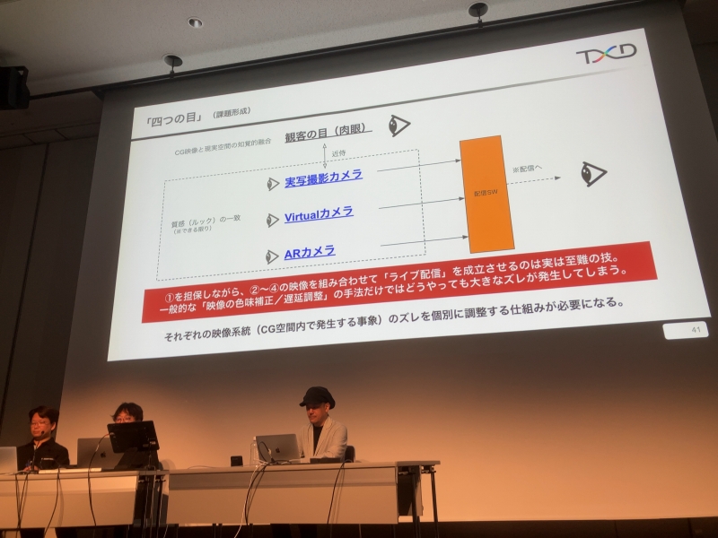 続いて、平野さんらが開発した技術のライブ現場での活用法の実例を、ライブの画像も見せながら、よしださんが解説。筆者とは真逆で、CG技術に詳しいが、VTuberのライブについては、よく知らないという参加者に向けての説明も興味深かった。また、現地会場のあるリアルライブでは、LEDビジョンに映るタレントなどのCG映像と現実空間の両方を観ている「観客の目(肉眼)」と、配信に乗せるための「実写撮影カメラ」「Virtualカメラ」「ARカメラ」という「四つの目」が存在することを解説。「主たるターゲット」は「観客の目」だが、配信のクオリティも重要で「三つの目」の質感や見え方などの整合性を取ることは、至難の業らしい。