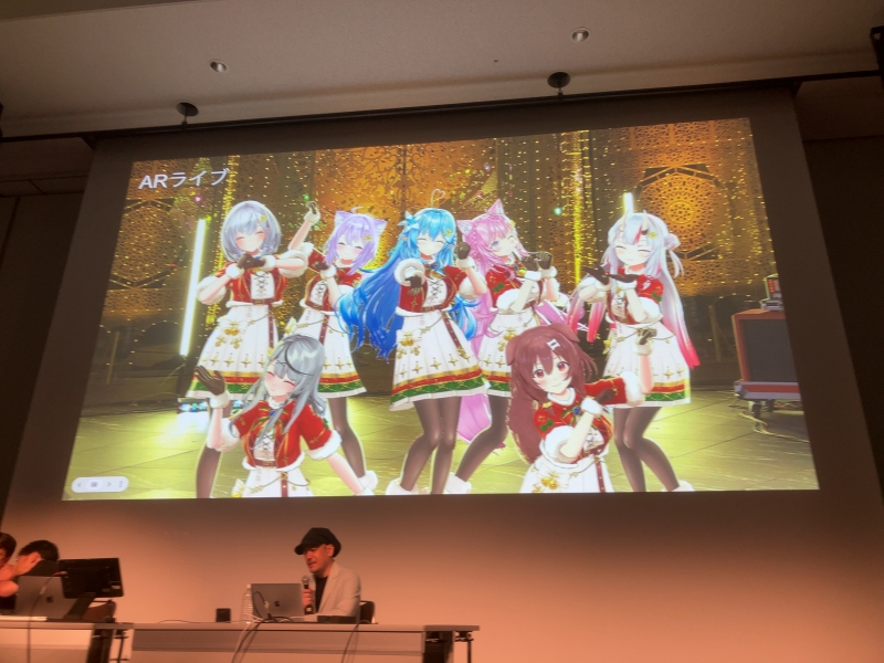 ARライブに関しても、2023年の「hololive Xmas AR LIVE 『Sweet Happy Holiday』」を実例に挙げながら、さまざまなこだわりが解説されていく。クリスマスイルミネーションで輝く新宿住友ビル三角広場をステージに事前収録されたこの公演では、床への落ち影の表現にこだわり、専用の落ち影システムも実装したらしい。