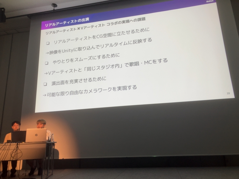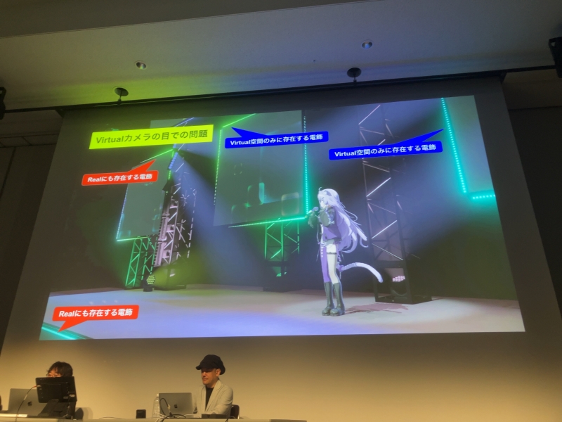 その後、YouTubeで現在も無料公開されている、きただにひろしさん、アンジョーさん、渋谷ハルさん、夢追翔さんによる「ウィーアー!」を上映。この曲のようなリアルアーティストとVアーティストのコラボを実現させるためには、どのような課題があり、どのように克服していったのかを溝口さんが解説していく。ボリュメトリックではなくクロマキー合成が採用されたことは、以前のスペシャル対談でも語られているのだが、このセッションでは、エンジニアの視点から、決定に至るまでの検証の内容も含む、より詳細な理由や技術的な解説も語られていった。