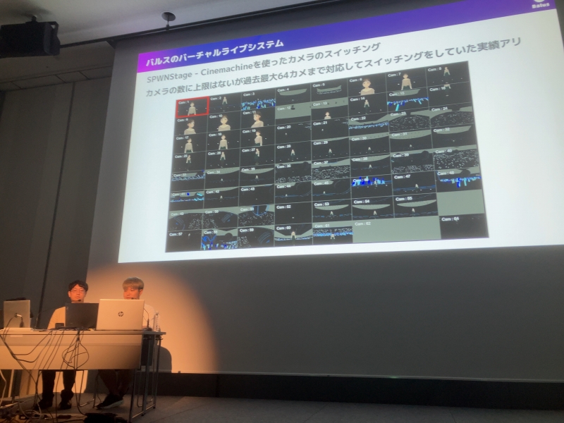 講演者は、2人ともUnityエンジニアで、「V神」では、溝口さんがAR周りのシステムを担当。伊藤さんは、(3DCGの見た目を決める)ルックデヴと、観客システムを担当したそうだ。まず、溝口さんは、「V神」でも使用された自社開発のバーチャルライブシステム「SPWNStage」を紹介。このパートで特に驚いたのが、カメラを制御するためのUnityの公式アセットChinemachineを使ったカメラのスイッチングについて。カメラを設定する数に上限はなく、過去最大64カメを切り替えながら使用した実績もあるそうだ。