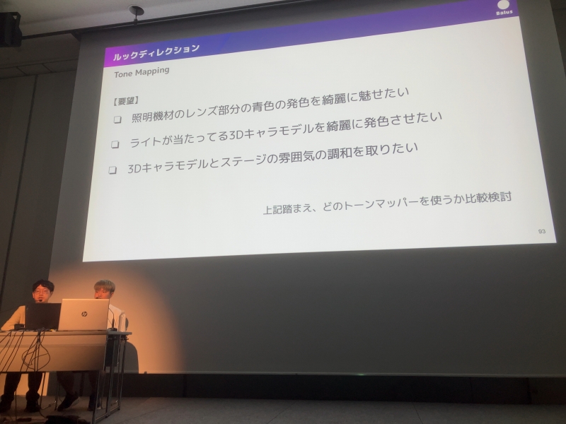 また、バーチャルタレントのルック(見た目)に重要な役割を果たす「エフェクト」の選定過程も紹介。非常に広い明るさの幅を持つデータ(HDR)をPCモニターやスマホが表現できる明るさの幅(SDR)に変換するためプロセス「Tone Mapping」で使用する「トーンマッパー」の選択について詳細に語られた。それぞれに特徴的で一長一短ある4つの候補に絞った後、テクニカルアーティスト、CG班、映像班、カメラ班、照明班、ディレクターなど多くのスタッフが意見を出し合い、決定していったそうだ。会場が広く明るく見える照明班の第一候補と、キャラモデルにフォーカスしやすいディレクターの第一候補の二つにまで絞られたが、その決定は難航。最後は、ディレクターの第一候補にライブ演出上の弱点が発見され、照明班の第一候補が採用されたそうだ。