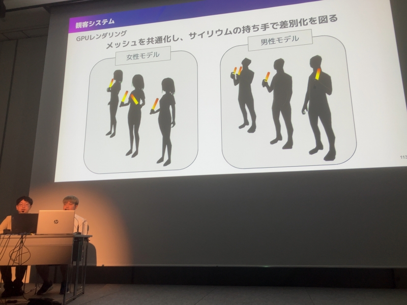 最後に伊藤さんは、「V神」で非常に印象的だった会場の観客についても解説。客席には、本家「アニサマ」を越える約1万6000人の観客がリアルタイムでレンダリング(表示)されているが、これは、より迫力のある観客の絵を作るため、ソーシャルディスタンスを無視して配置しているらしい。実際の映像を観た際、観客には何種類のモデルと何種類のモーションがあるのか気になっていたのだが、モデルは男女1種類ずつしかなく、それぞれサイリウムの持ち手(左右と両手の3種類)で差別化。それでも、合計6パターンしかないらしい。また、モーションキャプチャーにより収録した観客のアニメーションの種類も、わずか8種類。これらをランダムに組み合わせて、約1万6000人の観客を表現しているそうだ。