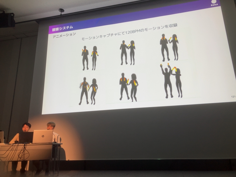 次に、伊藤さんがステージ制作について解説していく。「アニサマ」のリアル会場を再現しているということもあり、「ステージのライティングを現実の雰囲気に近づける」ことが課題に。さらに、「3Dキャラモデルがステージ上で映えるためのルックディレクション」「観客の人たちの動きをリアルに近づける」こともステージ制作上の課題となったそうだ。筆者にはUnityなどに関する知識がないため、溝口さんと伊藤さんが語る技術的な話は、理解できないことも少なくなかったが、最先端のVR&ARライブであっても、最終的に課題を解決するのは、熱量を持った人間の創意工夫であることは理解できた。