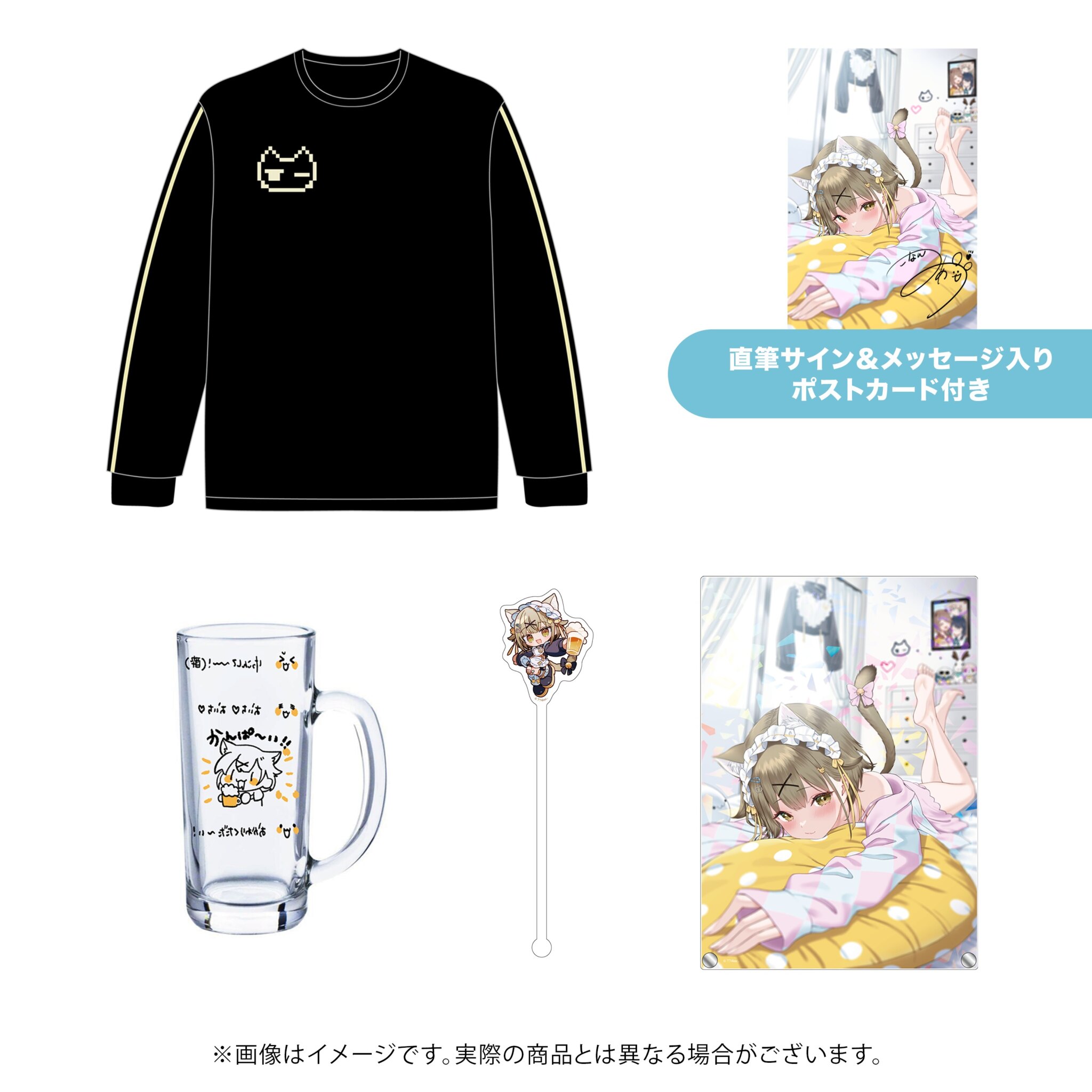 普段着・部屋着にも着られるロングTシャツだけでなく、お酒好きな湖南に合わせてビールジョッキとマドラーもラインナップされており、本人描き下ろしのデザインやアイディアが凝らされた一品になっている。
