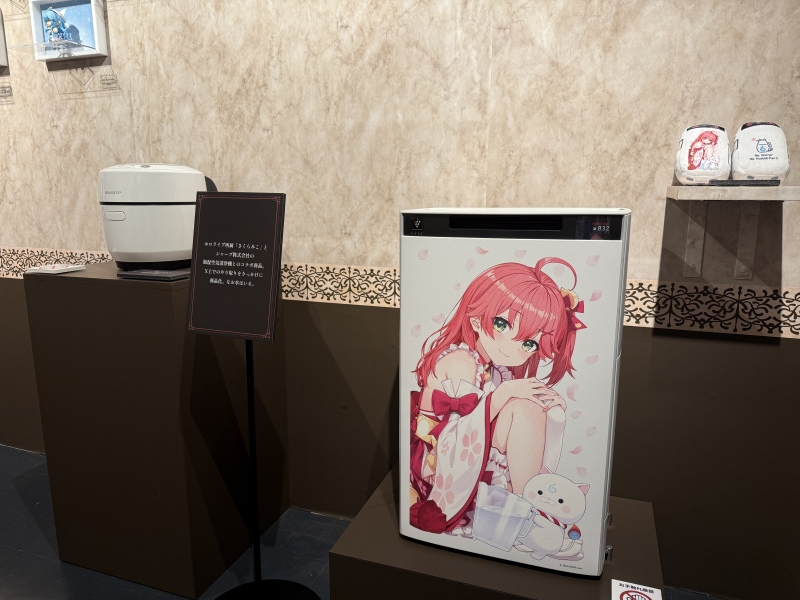 水が必要な加湿空気清浄機など、さくらみこさんとSHARPのコラボ家電の実機も展示されていた