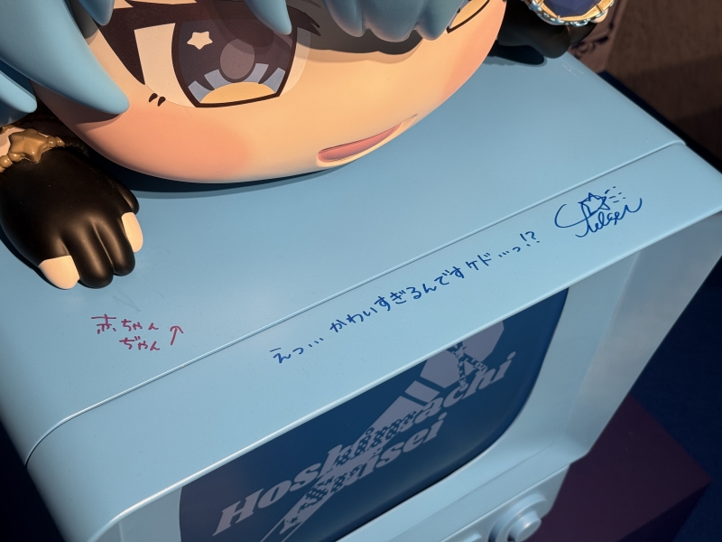 謎解きが大好きなすいせいさんのサインが入った展示品も発見。左の赤い文字は、みこさんが書いたもの?