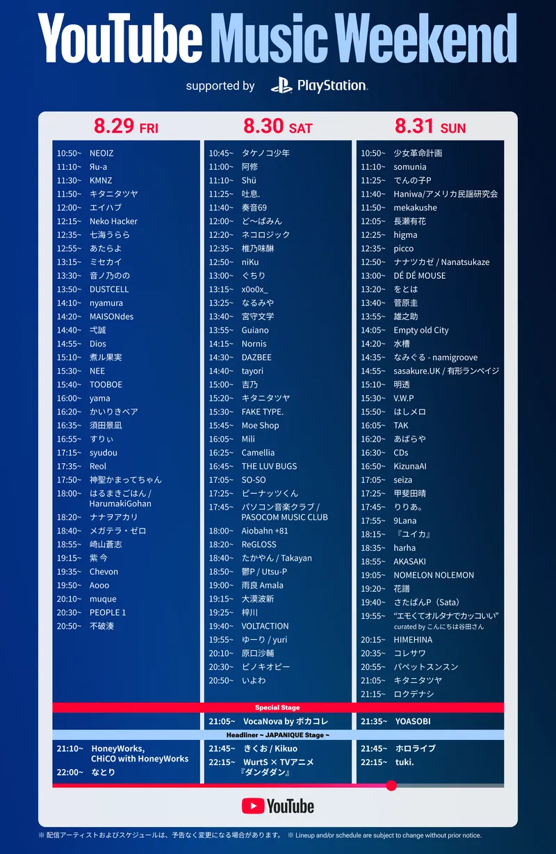 YouTube は、8 月29日〜31日の3日間にかけて、122組のアーティストが撮り下ろしライブ映像やミュージックビデオなどをプレミア公開する「YouTube Music Weekend 10.0 supported by PlayStation®」を開催する。