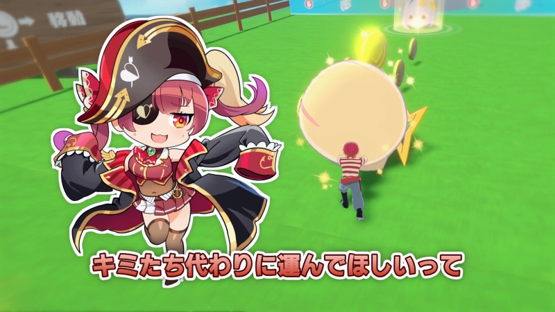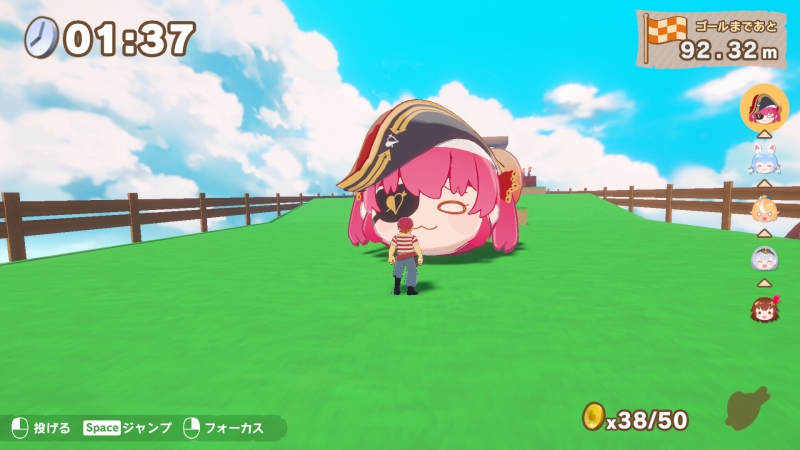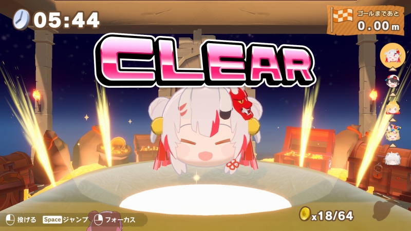 それらをくっつけることで、次は白銀ノエルさんのお宝に変化。同じノエルさんのお宝が待つ二つ目のチェックポイントまで転がしていき、今度は、不知火フレアさんに変化させる。そうやって、リレーのようにお宝を変化させながらゴールを目指すのだ。
