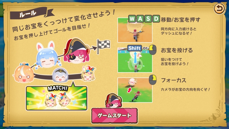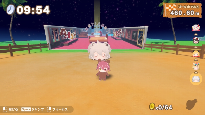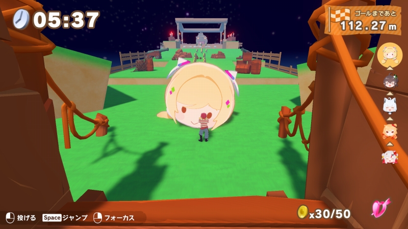 前作「ホロライブ お宝マウンテン」では放り投げてくっつけていた「お宝」を、ゴロゴロと転がしながら坂道の上にあるゴールまで運ぶのが、「ホロライブごろごろマウンテン」の目的。操作は非常にシンプルで、WASDでキャラクターを移動。「Shift」キーかマウスの左クリックでお宝を投げ、右クリックでカメラがお宝の方向に向く。また、コントローラーでの操作も可能。PS5のコントローラーをUSB接続して少し動かしただけで、自動的にコントローラー操作へと切り替わった。