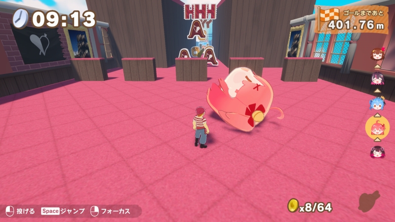 個性的な髪型や角などの突起物も多いお宝は、物理演算で予想外の方向に転がることもあり、意外とコントロールは難しい。また、ここまで何度かお宝を「転がす」と書いてきたが、操作キャラの移動速度が遅いため、実際には前方にお宝を投げながら進んでいくことも。障害物を越えるために強く放り投げると、あらぬ方向に大きく跳ねてコースアウトしてしまうこともある。