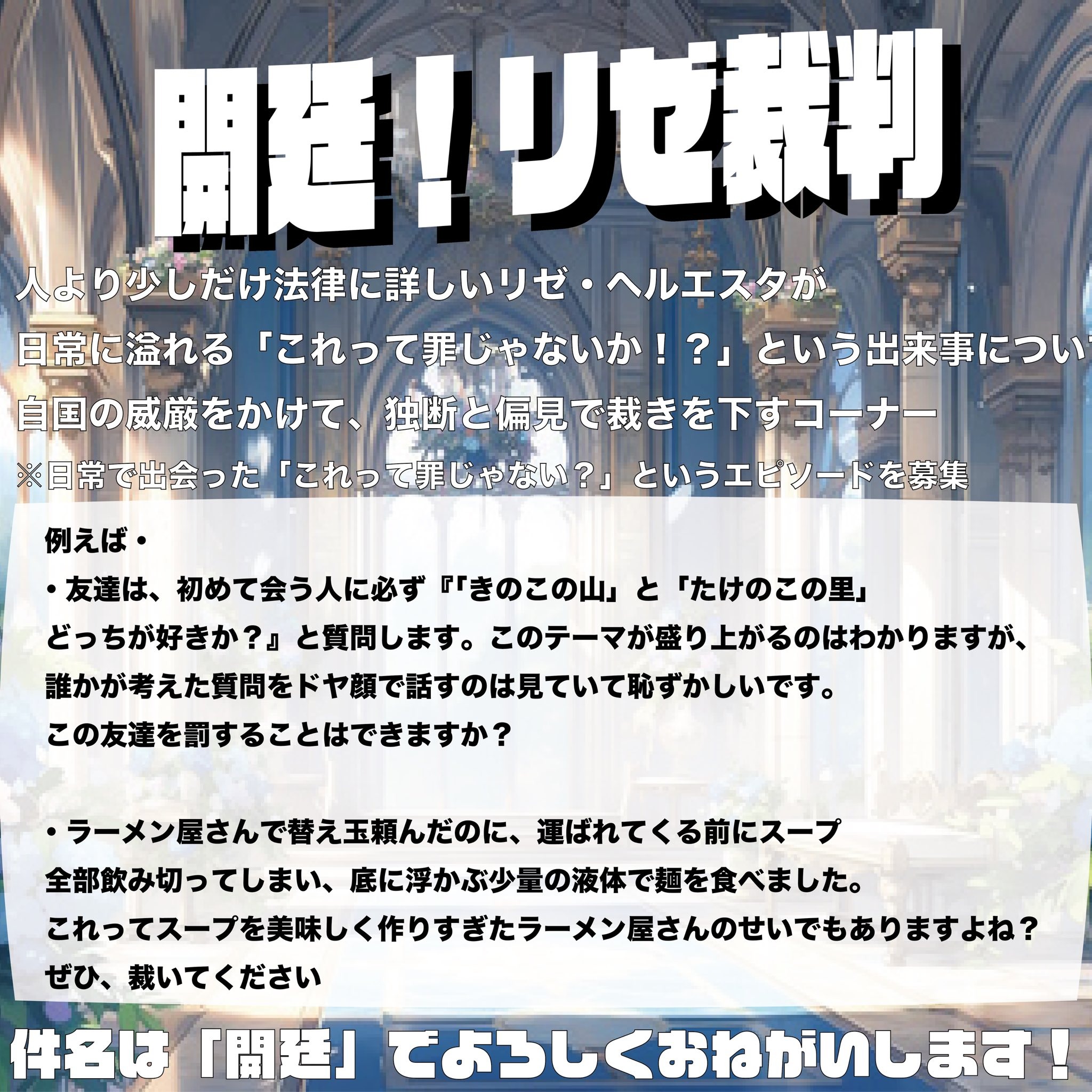 オールナイトニッポン公式Xによれば、「開廷!リゼ裁判」「リゼ様の皇室教室」の2コーナーを予定しており、2コーナーに関するメールを募集しているとのこと。