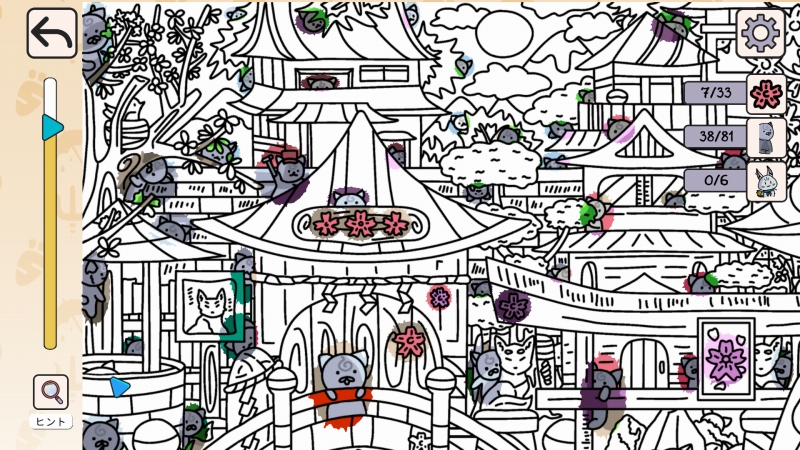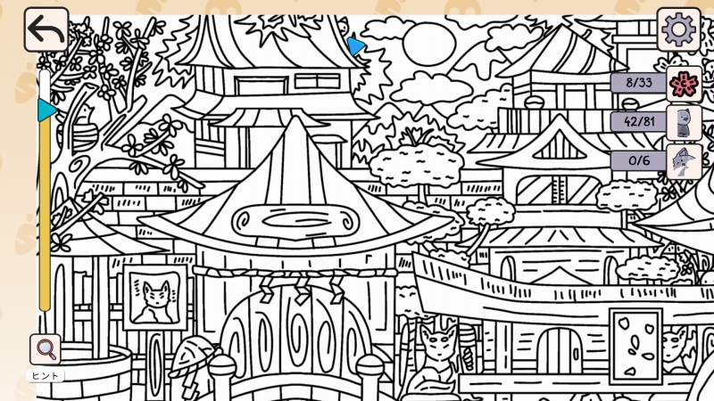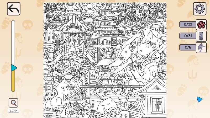 初期段階で選べるイラストは4種類。「イージー」と「ノーマル」の2種類の難易度が選択できる。ゲームをスタートすると、線画のイラストが表示され、画面の右には、探すファンとアイテムの数が書かれている。