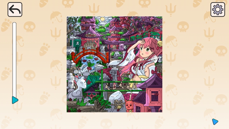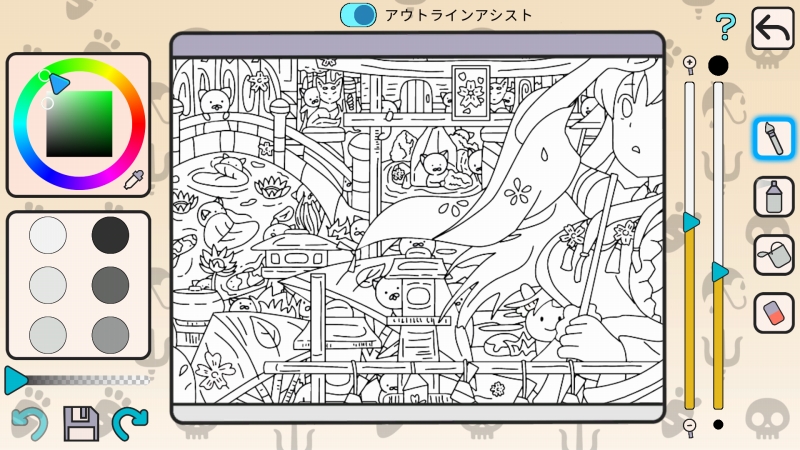 また、ゲームとしてだけではなく、線画に自由な色を付ける「塗り絵モード」で遊ぶことも可能。カラーサークルパレット、筆ツール、バケツツール、ブラシツールなどのツールを使えて、ショートカットも実装。ゲームのおまけとしては、かなり充実した機能だろう。完成した塗り絵は、PC内に保存もできる。発売後、XなどのSNSでは、さまざまな人の作品が観られそうで楽しみだ。