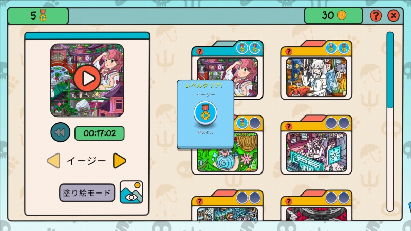 金メダルを集めるごとに、ロックされていたレベル5以上のイラストも順番に解放。クリアした際にもらえるコインは、ショップで使用して、カーソルの形、発見エフェクト、効果音を購入できる。