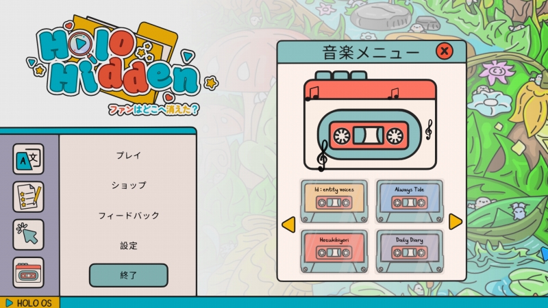 本作の魅力でもある心地良いBGMは、デフォルトではイラストごとに決まっているが、トップ画面の左にあるカセットテープマークをクリックして、「音楽メニュー」から変更も可能。Kobo Kanaeruさんの「Mantra Hujan」や、兎田ぺこらさんの「ぺこらんだむぶれいん!」など全7曲のホロライブオリジナル曲のアレンジBGMを選んで、固定BGMにできる。