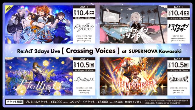 Re:AcTが10月4日~5日にSUPERNOVA KAWASAKIで開催するツーデイズライブ「Crossing Voices」の一般チケットが、現在発売中となっている。