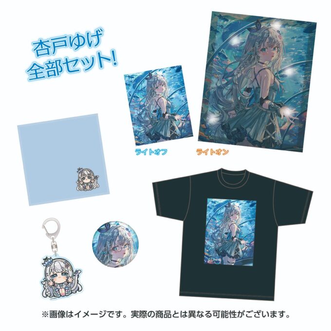 Tシャツ、刺繍タオル、缶バッジ&アクリルキーホルダー、LEDライトボードなどのアイテムが販売されており、全部セットには直筆メッセージ&サイン入りポストカードがついてくる。