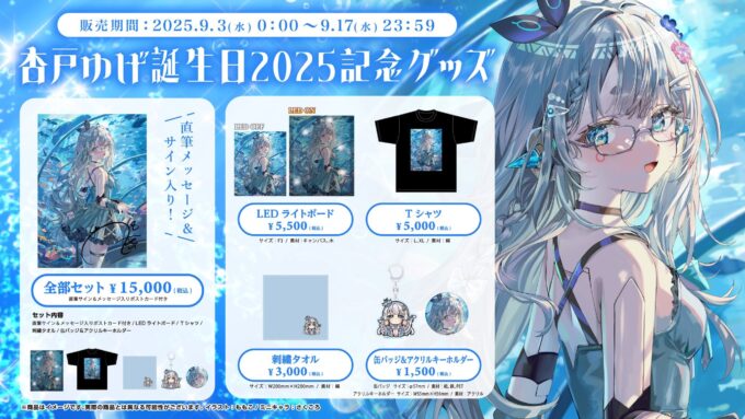 ななしいんく 杏戸ゆげの誕生日グッズが販売がスタート、2025年9月17日までの受注生産販売となっている。