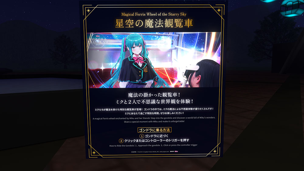 今回、ちょうど「夜空プログラム2025」では、9月12日12時~9月22日12時の期間限定で公式VRChatワールドをオープン。リアルの遊園地では、初音ミクと一緒に観覧車に乗れるMRコンテンツ「星空の魔法観覧車」を実施し、それをVRChat上でも再現するという、リアル/バーチャル両展開の企画を展開しています。