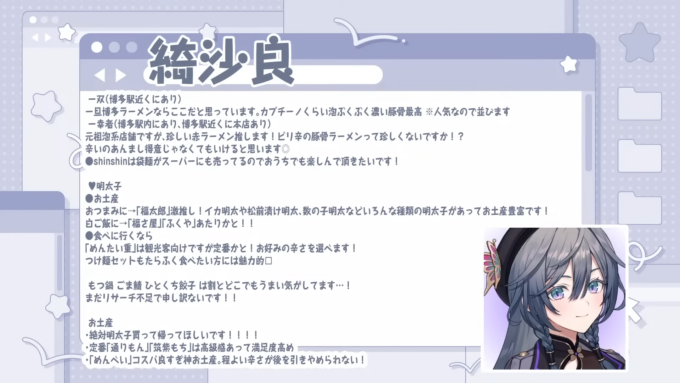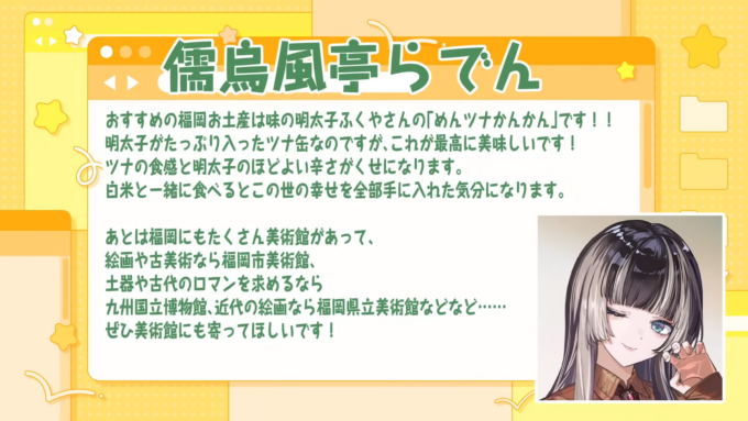にじさんじの鷹宮リオンが、2025年9月11日に「配信者やリスナーの福岡おすすめグルメやお土産・スポットを見ていこう~!」配信をおこない、福岡県のおすすめスポットや料理などを特集する内容で多くのリスナーから注目を集めた。