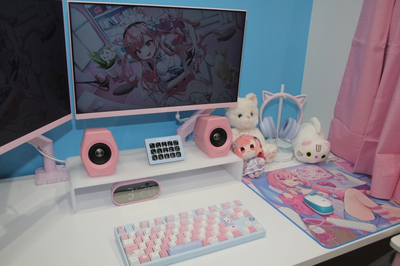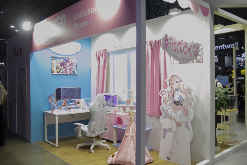 ハピネットブースのあるホール7とは別棟で、一旦、外に出て移動することになるのだが、ホール9の「Pixio」ブース(09-E40)では、結城さんのゲーミングルームを完全再現。
