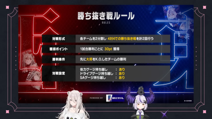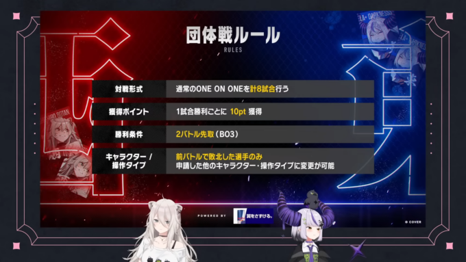 東軍と西軍に分かれての対抗戦となる今回は、おなじくホロライブに所属するラプラス・ダークネスがリーダー役として参加し、獅白が西軍リーダー、ラプラスが東軍リーダーとして両軍を率い、8vs8での団体戦および勝ち抜き戦が行なわれる模様だ。