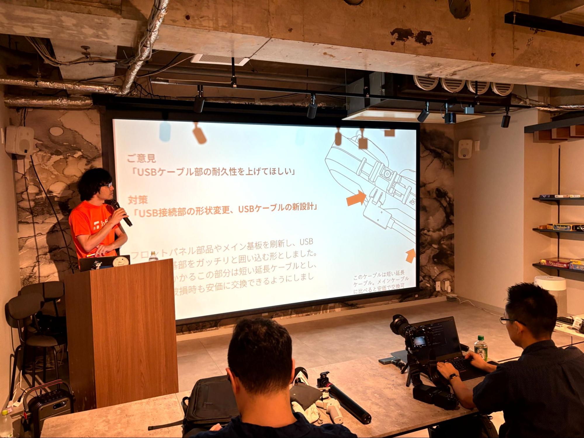 Discordコミュニティメンバーから要望を受け、改良されたポイントはいくつかあります。まずは本体のUSBポート部を、USBケーブルのコネクタ部を支える形状としたこと。また短いUSB延長ケーブルを用いて、数メートルの長さになるケーブルの重さは側面のアームで支えるようにしました。