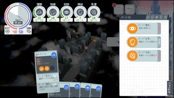 謎解きは、プレイヤーのパラメータを用いた「調査判定」に成功することで進行する。都市に散らばる「アイテム」でパラメータを強化し、さらに「パーク」を組み合わせることでアイテムの効果を高められる。限られた時間の中でアイテムやパークを集め、戦略的に調査判定を突破して謎を解き明かしましょう。