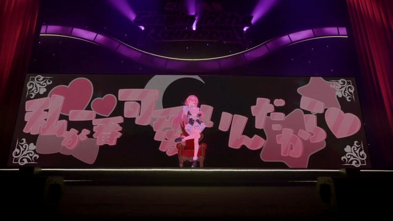 星導さんが去り、無人になった真っ暗なステージ。一つの影が下手から現れて、中央奥の豪奢な椅子に座る。会場前方の観客には、影の正体が見えている様子で歓声も聴こえてきた。明るくなったステージで、椅子にちょこんと座っているのは、サンゴさん。共通衣装の注目ポイントとして頭のティアラをアピールしていたお姫さまが可愛さ全開で歌うのは、ボカロ曲の「我儘姫」。間奏では椅子から立ち上がり、ステージを左右に動きながらピンクの光に染まった客席のファン一人一人を魅力していく。途中からは、兎の人形を抱きかかえて、その仕草は、さらに可愛さをましていく。