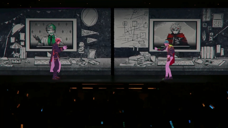2曲目、ボカロ曲「フィクサー」のイントロが流れ出し、ステージに立っているのがセラフさん&星導さんだと分かると、客席から大きな歓声が上がる。さらに会場を煽った二人は、イントロ終わりに「星導くん、よろしくお願いします」「よろしくお願いします」と声を掛け合い歌い始めた。テンポ良いリズムと不穏な空気感が入り混じる楽曲と、二人の湿度高めで生感も濃い歌声が絶妙にマッチ。会場の熱気がさらに高まっていることは、ネット経由でも伝わってくる。