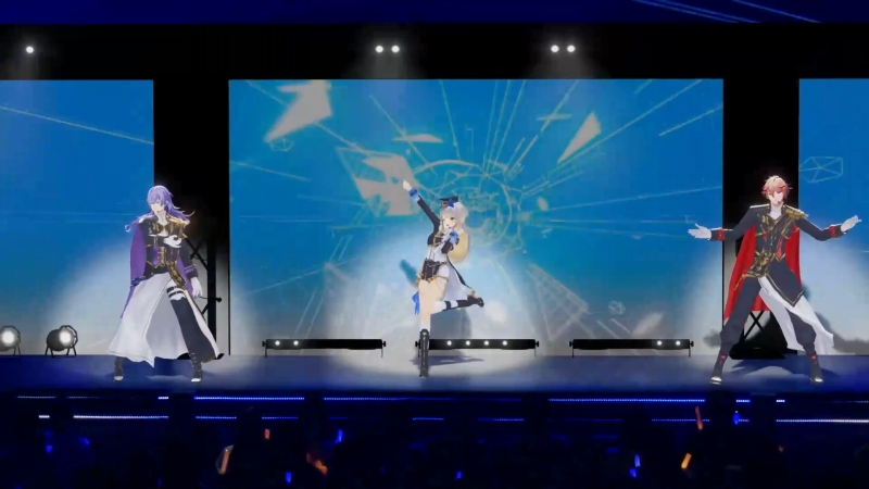 男性ライバーペアの後は、女性ライバー3人組、サンゴさん、サロメさん、栞葉さんが、大きな鳥籠に入ってステージに登場。ゲーム「プロジェクトセカイ カラフルステージ! feat.初音ミク」の作中曲「ジャックポットサッドガール」を歌った。3人とも奇麗な高音が印象的だが、それぞれの歌声が重なっても個々の魅力を感じられるほど歌声の個性はバラバラでバランスも良い。また、3人が可愛くシンクロするサビのダンスは、センターを入れ替えながら、3回披露された。