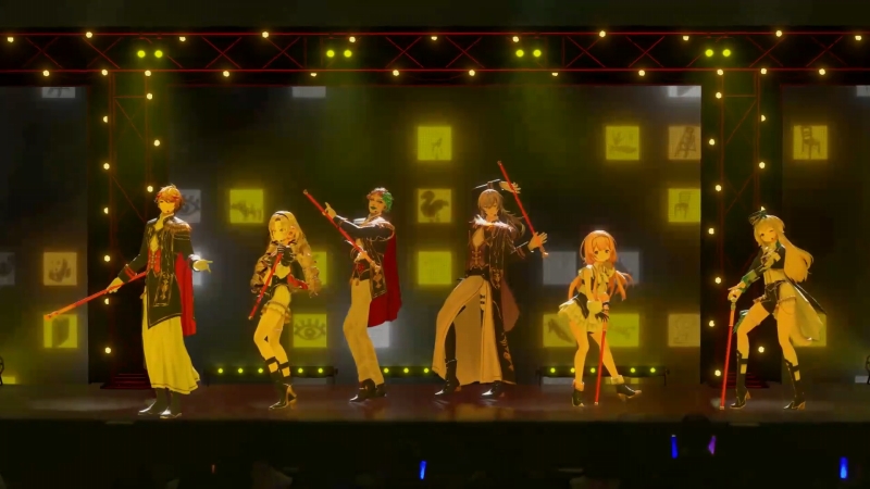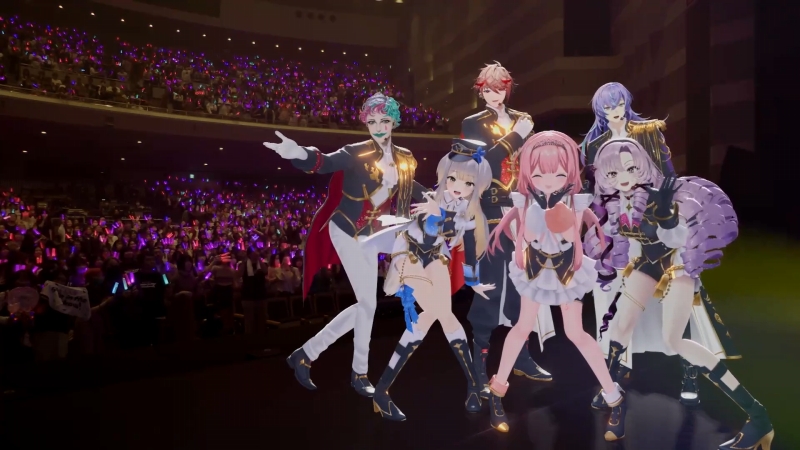 1曲目は、にじさんじの秋をテーマにした全体曲「ヨナガオルケスタ」。まさに宴の始まりにぴったりな楽曲で、しかも、力一さんと星導さんは、配信音源などで歌っているオリジナルメンバー。この広島公演の開幕にはピッタリの選曲だ。ステージに並んだ6人は、順番にソロパートを熱唱。セラフさんが「心の仮面を脱ぎ捨てて」と歌った後、全員が仮面を投げ捨てた。基本、フリーで踊りながら、サビなどのピンポイントでは6人の振りが揃う。開幕からまさにショーのようなステージ映えするパフォーマンスだった。また、サンゴさん、セラフさん、星導さん、栞葉さんは、このライブで共通衣装初披露だったのだが、出し惜しみせず1曲目の冒頭から全員同時披露だったことには少し驚かされた。
