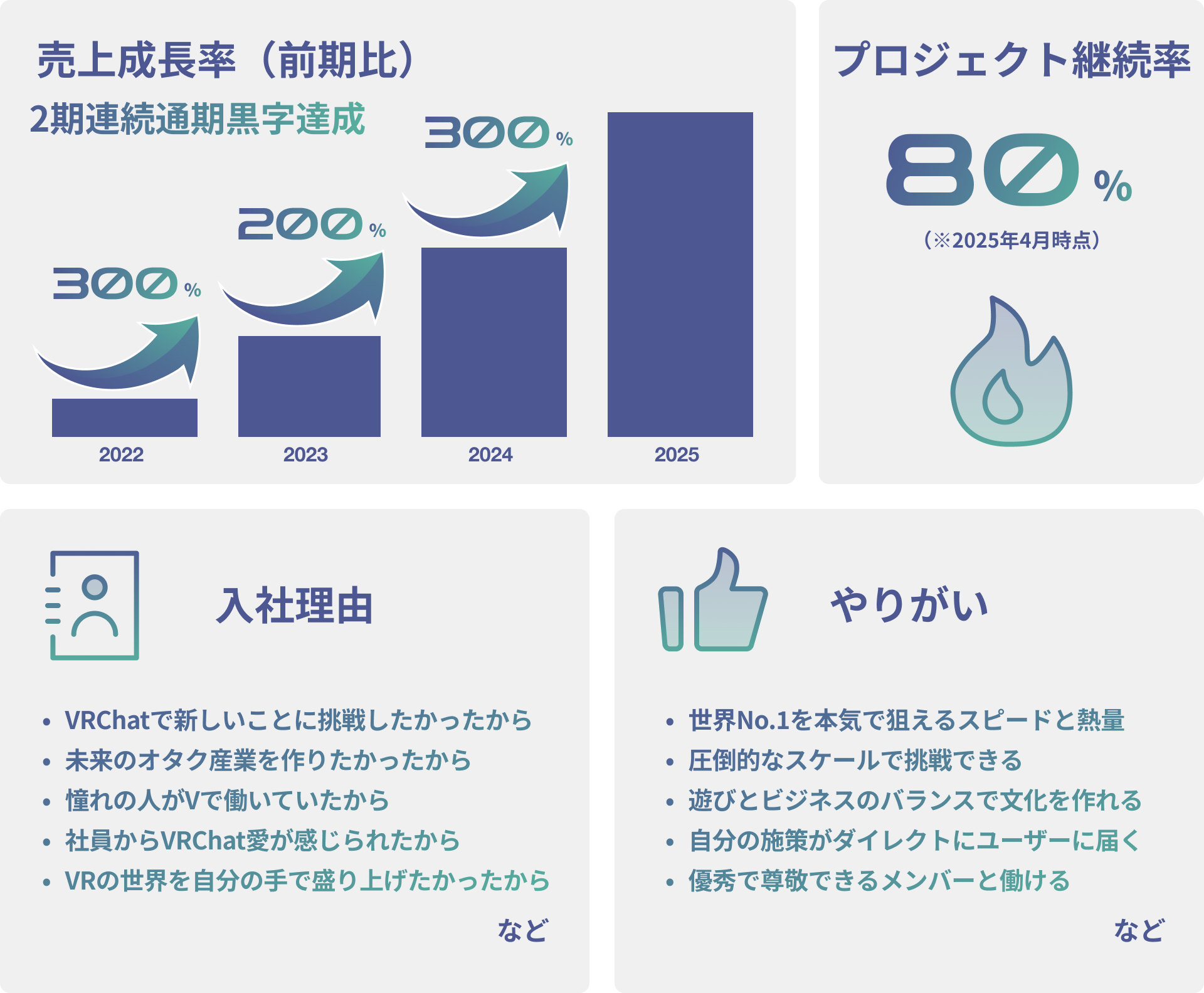 「VRChatの延長線上で新しいことに挑戦したい」「憧れていたV業界の人々と働きたい」「働くメンバー自身がVRCユーザーで、VRCへの深い愛を感じた」「XRを通じてお客様の課題を本気で解決したい」「ユーザー主体で文化を盛り上げたい」といった声が寄せられています。