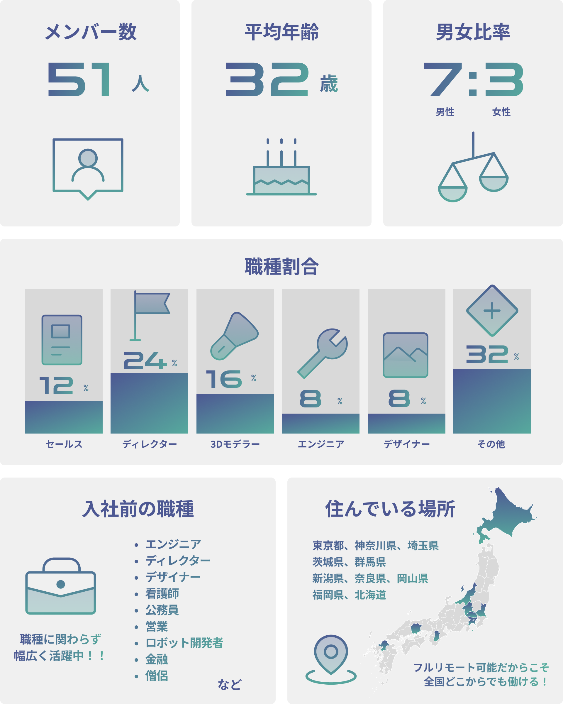 社員一人ひとりの「職種」や「VRChatとの関わり方」などの、Vならではのユニークなデータを深掘りし公開いたしました。