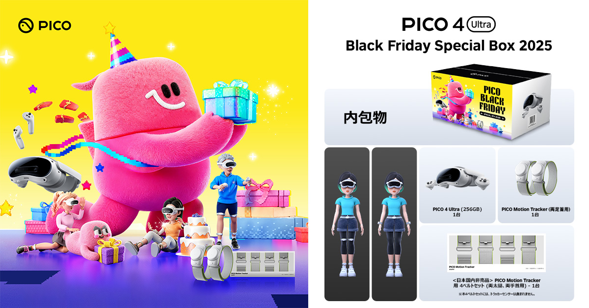 独自のイノベーションと研究開発力を持つXRブランド「PICO」は、2025年11月21日(金)00:00~12月1日(月)23:59の期間限定で、「PICO 4 Ultra – Black Friday Special Box 2025」(以下、本セット)を数量限定で発売します。