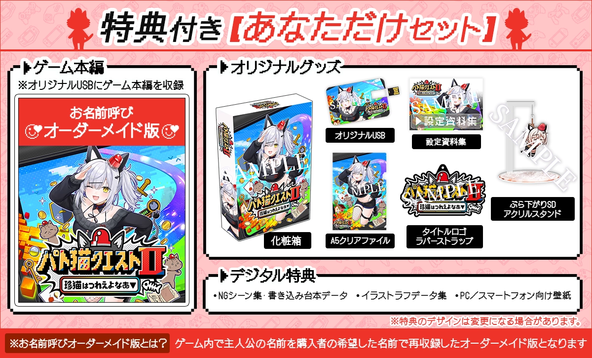 好評につき予約受付数を追加で50名まで拡充した、主演の「猫元パト」さんが購入者の名前をゲーム内で呼ぶオーダーメイド版の「『パト猫クエストⅡ 珍猫はつれえよなあ』特典付きあなただけセット」(税込み29,700円)が残りがわずかとなっています。