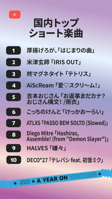 YouTubeは3日、2025年日本のYouTubeでの注目されたトピック、トップ登録者増加クリエイター、トップ楽曲、トップショート楽曲の年間ランキングを公開。
